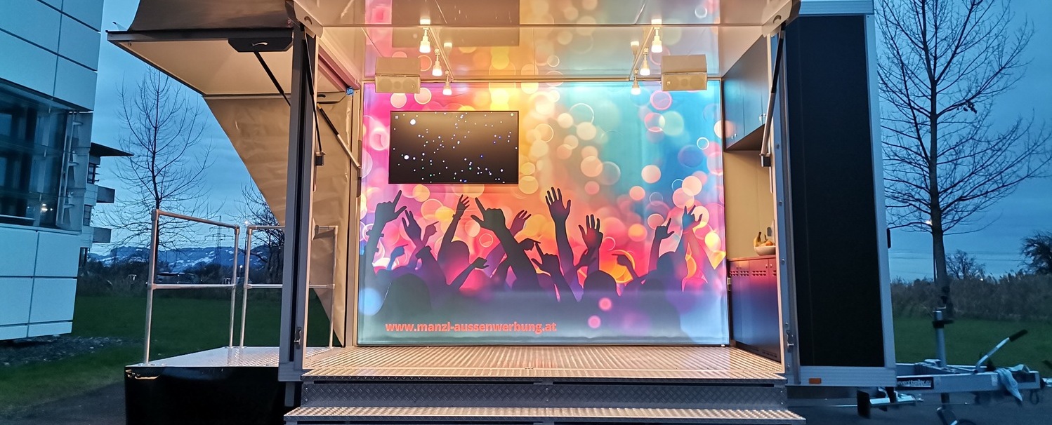 Und wenn’s mobil sein soll – mit unserem mietbaren Eventtrailer bieten wir euch eine aufmerksamkeitsstarke Lösung für unterwegs an. Dieser ist ideal für Promotion-Aktionen jeder Art, Messeshows oder als rollende Bühne für euren perfekten Markenauftritt.